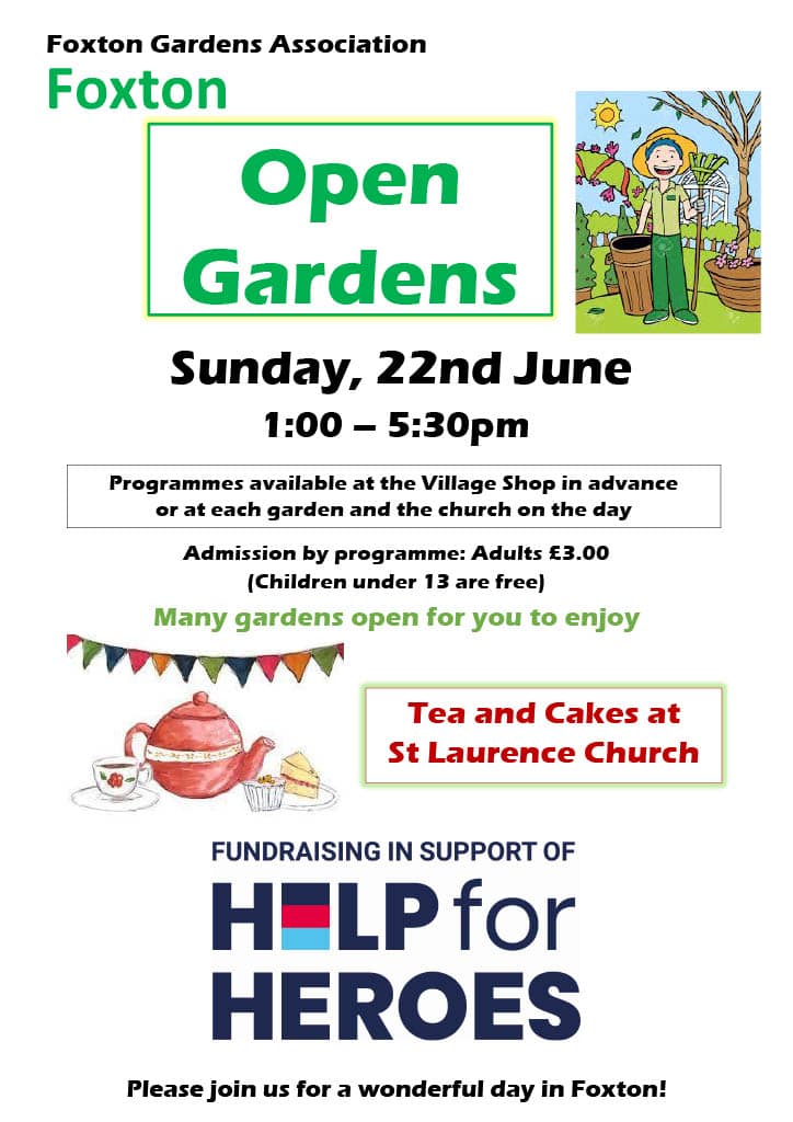 This Sunday we will be hosting our Open Gardens event. Programmes with a map of the gardens are now available in the Village Shop and can also be purchased on the day at St Laurence’s church where we will be serving tea and cakes. This year, all profits will go to Help for Heroes.